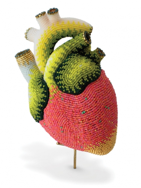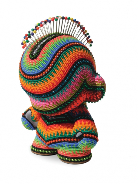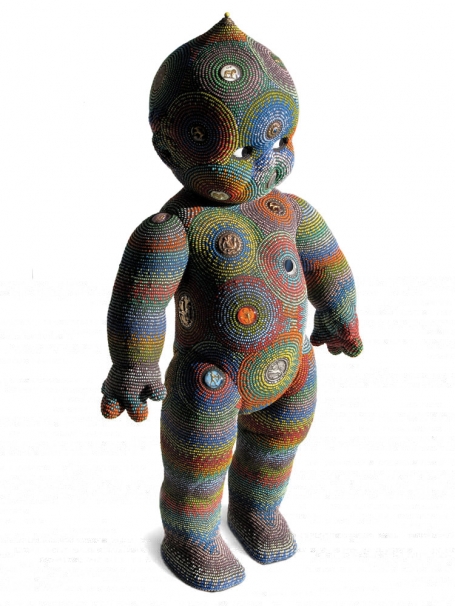 Her work reveals some interesting fixations. Huling stuck fake dog poop on a Kewpie's head and beaded it in bright blue and fiery red, calling the $3,200 piece Poopyhead. "I have a fourth-grade boy's sense of humor," she admits; all her creatures, great and small, display highly decorative posterior orifices.
