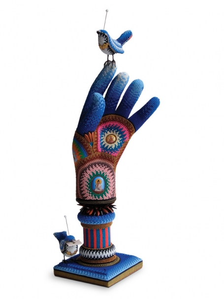 Moving toward the higher end of taste, Huling creates resplendent blue-beaded teapots, a bejeweled bird perched atop each one. The vessels serve up irony as magnificent objets d'art, with $4,200 price tags disguising 12-buck teapots from Chinatown.