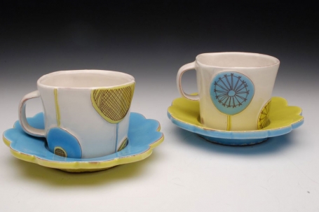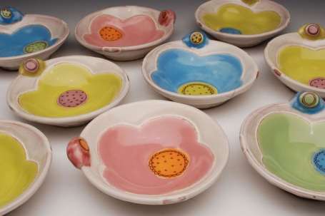 Is it spring fever? I can't stop looking at Kari Radasch's luscious new glaze-fired terra cotta work, with its bright - but not too bold - colors, clean designs, and cheerful iron-transfer decals. I smiled to read in her artist's statement that, along with many other sources of inspiration (design objects, textiles, mosaics, to name a few), she says her pots and surface are "rooted in the garden" - it makes beautiful, organic sense.
