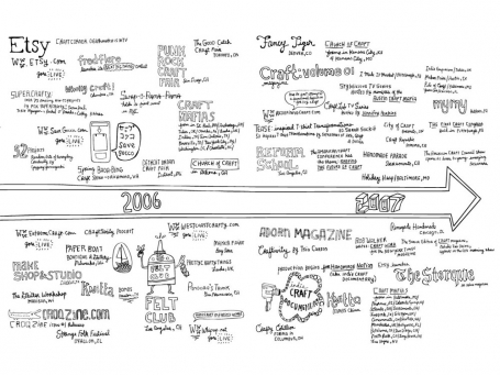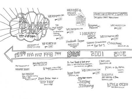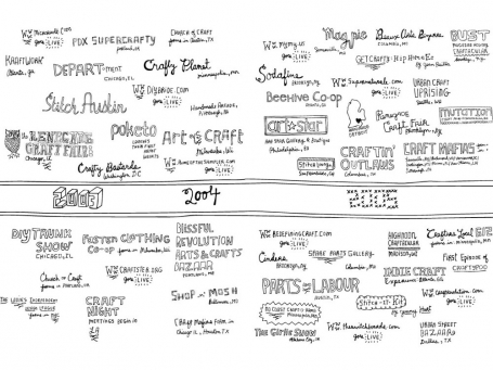 As we cobbled together 70 years of craft history for the uber timeline in our August/September issue, we had way more to choose from than we could include within our pages. Contributor Faythe Levine, perhaps best known for her film Handmade Nation, sent us a delightful bonus timeline of "The New Wave of Craft." Illustrated by Kate Bingaman-Burt, the timeline takes us from 1994 through 2007, from the beginnings of Venus Zine and Bust and the inaugural Stich ‘n Bitch group to the formation of regional craft mafias, indie craft fairs, craft websites, and more. It's simply too charming to keep to ourselves. You can scroll through the images or download a PDF below. Enjoy!