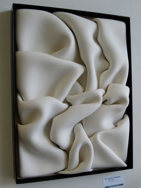 Jeannine Marchand's Bittersweet is similarly deceptive. It looks like pristine fabric, framed in wood. But it's white earthenware bordered by steel.