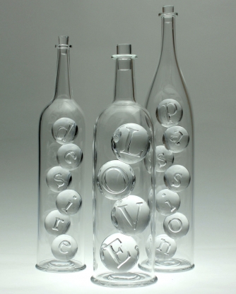 These differences may arise from personal inspiration. “My work often stems from being a woman, a mother and a wife. It’s grounded in the here and now of my life.” Russell-Pool says. “I have a beauty aesthetic; there’s enough ugliness in the world.” That beauty can be seen in her use of color—she admits to being enjoyably obsessed with the subtle variations that come with creating her unique color palette. Neither color nor beauty is the focus for Petrovic. “Glass, more than any other material, is championed because of its virtuosity and color,” he says. “I don’t want my work to be about beauty.” Petrovic’s aversion to color may come naturally, since he recently discovered he is color-blind—an eye-opening (to say the least) realization of why he has struggled with certain color palettes all his life. Beyond this, though, is a passion to create something that helps him address his own life questions. His Distilled Life series, for example, consisting of clear bottles containing groupings of glass objects, is an effort to understand identity and relationships.