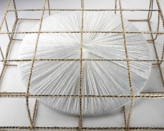 The five works on display, Chow explains, stem from a “conceptual, post-minimalist ideology” that she combines with design and craft elements to seduce the viewer. She sees them not only as “poetic mediations,” but as “visually compelling objects that convey deeper meanings.” For instance, in 36 Chambers —a floor installation consisting of 36 two-foot-square steel cages laid out in a six-by-six-foot grid, each enclosing a glass disk entwined in twisted clear plastic wrap for a luminescent effect—Chow has softened the black lines of the metal cage by crocheting nylon horsehair—a millinery material—around them. “It’s like a partially erased line drawing,” she says, enjoying the paradoxical combination of hard and soft, masculine and feminine.
