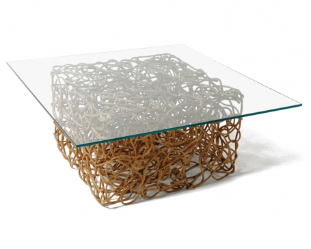 Urso’s glass-topped Knoop tables (the word is Dutch for “knot,” a nod to that country’s avant-garde designers) are also inspiringly unlikely. For their bases, he permeates hundreds of feet of rope with resin (a medium he’s mastered through experimentation), and in the 45 minutes before it all hardens, quickly fashions the lengths into a dense, wild tangle—like a high-style rat’s nest or root system—in a precise cube or other shape. Once again, conflicting ideas—gravity defied, frenetic motion stilled, organic material in geometric form—blend to make an innovative, wholly functional piece of furniture.