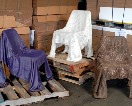 “Confuse, amaze and entertain your guests” is the pitch on Urso’s website for his aptly named Specter chairs. To make them he takes fabric, infuses it with resin, then hand-molds it into the form of a seat casually draped with a sheet or blanket. Frameless, hollow, lightweight, the result is indeed ghostly (especially when done in see-through, openwork mesh) and deceptive in more ways than one. At once soft and solid, animated and inert, ethereal and sturdy, it’s a trompe-l’oeil sculpture you can sit on. Each Specter is oddly anthropomorphic, with a distinct personality depending on fabric and color: there’s the pristine white modern one, the earthy-brown embroidered one, the retro hipster with the Eames pattern.