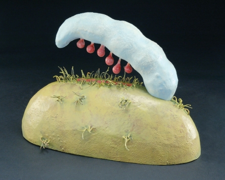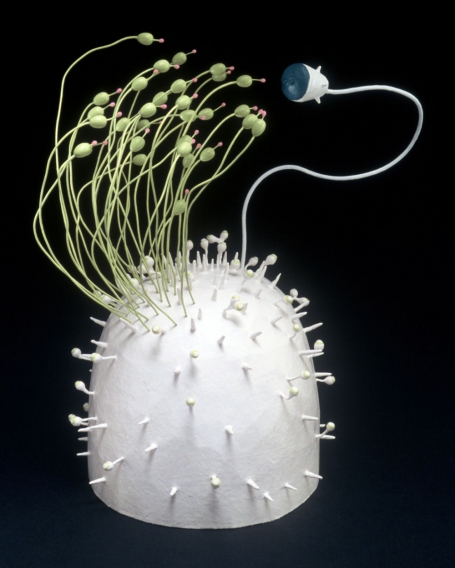 Natural Selection, Pfeifer’s installation at the Ogle gallery, has an exterior structure resembling a greenhouse one might find at a botanical garden. Within it she has arranged hundreds of plant-like objects that she likens to Japanese bonsai, but bonsai that “suggest scenarios where plants can choose their mates the way humans can—a blend of natural instincts and intellect.” Among her sources of inspiration, alluded to in the title, are “Darwin’s writings pertaining specifically to plants, modern challenges to evolution theory, personal experience and art history.” This miniaturized, teeming environment continues Pfeifer’s “exploration of the ways that humans attempt to control nature, and in turn, nature finds a way to adapt or reassert itself, such as grass that grows in the cracks of a sidewalk or mildew that forms on an uninsulated wall behind a couch.”