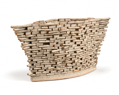 Over a 30-year career the Seattle ceramist Jim Kraft has demonstrated the variety possible in handbuilding earthenware, having created indoor tile murals, vessels and sculptural pieces. Of the evolution of his work, he says, “I take certain elements that ‘work’ in one series and often build the next series based on those elements. These can include the color of the clay body, the colors of the surface treatment, the texture of the surface, the form or the building technique.” Common to many of his works is the idea of smaller parts making up the whole, such as vessels made with extruded coils and brick-like pieces, or strips cut or torn from a clay slab, all to a basket-like effect.