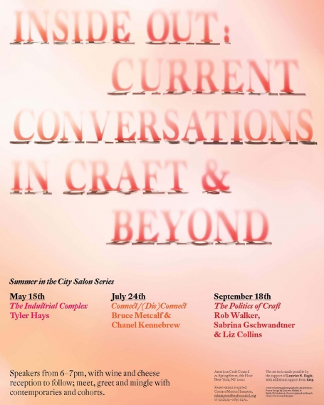 We decided to call our second Summer in the City Salon Series “Connect/(Dis)connect” and invited jeweler, educator and writer Bruce Metcalf and Chanel Kennebrew of Junkprints, an indie craft artist, graphic designer and Etsy seller, to engage in a lively conversation that will explore the complicated relationships between the broad spectrum of craft makers.