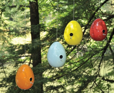 At Jim Schatz’s creek-side home and studio in upstate New York, the trees bear the fruits of his labor: glossy, egg-shaped earthenware bird houses and feeders, including Red Hot, in a rainbow of colors, tended daily by the artist and product-tested by chickadees, grosbeaks and cardinals.
