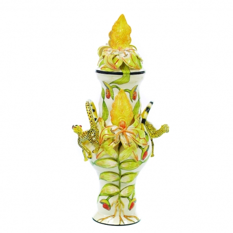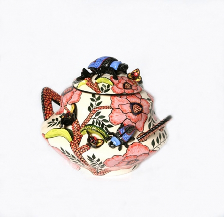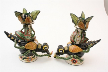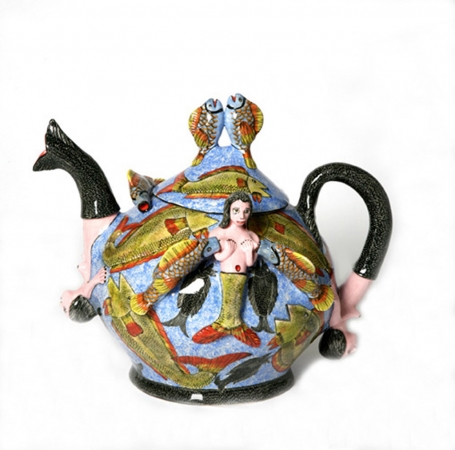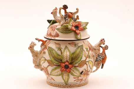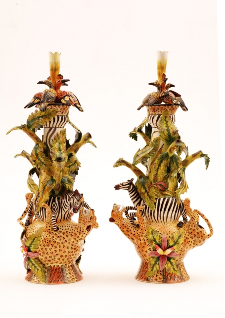 There were lots of captivating small pieces—salt and pepper sets, sugar pots, bowls, butter and sweet dishes—playfully sculpted either as surreal reflections of nature’s inhabitants—giraffes and crocodiles, to name a few, or with creatures frolicking on a lush range of colorful, tropical scenery. Among the exuberant urns, plates, teapots and tureens of flora and fauna, mermaids mingled, like guides to some mystical aquatic world.