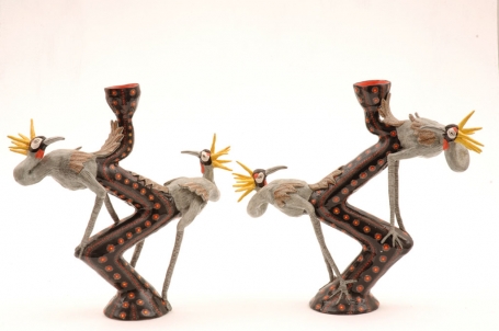 A bevy of ingenious candlesticks and vases in surprising shapes invited long gazes. Leopards, zebras and birds cavorted on a pair of candlesticks in a rich palette of green, rose and yellow-orange. The distinctive Crested Crane Candlesticks, sculpted by Victor Shabalala and painted by Jabu Nene had an air of slight condescension. Sculpted by Layeki and painted by Zinhle Nene, the Elephant Vase was stunning, with its leafy pattern on a black background.