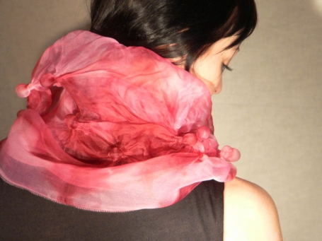 Textile artist Amber Coppings’ art-to-wear line consists of hand-dyed shibori silk organza accessories. Her signature creations are “Bubble Wraps,” 3-D textile wraps with permanent fabric bubbles embedded in the design. Vintage buttons, marbles, thread spools and other items are used to create the shapes in the cloth. All extra scraps and cut threads are incorporated into Bubble Necklaces and other fiber art jewelry, recycled fabric scarves, collages, or gift wrap.