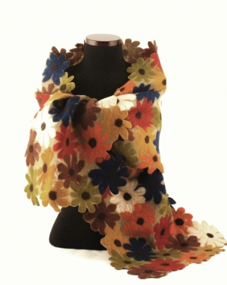 Elizabeth Rubidge is self-taught felt artist with a background in design and textiles, who employs the wet felting method of 100% merino fiber infused with hot soapy water. A series of heat and friction cause the fibers to expand, contract and fuse together to form a non-woven cloth. Color and elements from the natural world are the chief inspirations for her cozy scarves, throws and wraps.
