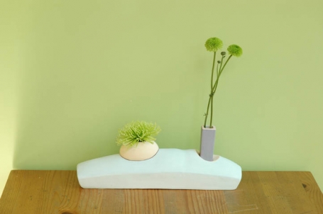 Ryan Takaba is currently an instructor and the ceramic studio manager and instructor at the Southwest School of Art and Craft. His “budvases” are forms that beg for specific floral elements to complete the sculptural composition. Simple flowers with strong linear forms are dialogue with the viscous glaze material as well as quiet colorful shapes. Each shape is a separate unit allowing for the owner to remove the water reservoir in the refilling process and are hand-built using the coil forming technique through paddling and rib shaping.