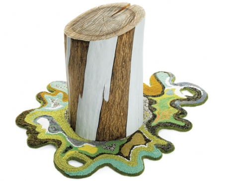 The sculptural works in the show are an even greater challenge to the hooking tradition in not being rugs at all. Inspired by topiary, Everblue by Mary Jane Andreozzi is a shaped, spiraling tree rendered surreally in brilliant blues rather than green. Nature stylized is also the subject of Fay’s Tree Skirt; Moss and Lichen Series #1, a cartoonish rendering of a tree stump set on a “skirt” of variegated moss. The vessel is represented by Beth Kempf’s resplendent Flowers Galore and Molly Colegrove’s colorful Jester Bowl, out of handspun yarns and ribbons. Both Marilyn Bottjer’s Four Seasons on the North Fork, hooked scenic foldout postcards and their hooked box, and Leave and Stay, by Linda Rae Coughlin (who also created Pinned, Pearled and Out of the Box), two pieces with feminist messages staged in a recycled suitcase, flirt with cuteness—a danger in hooked work—but avoid it through wit and masterly execution.