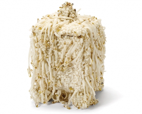 A number of the artists take the two-dimensional pictorial format of what is often seen as a folk medium in sophisticated directions. In Contrasts, Alice Rudell’s choice of black-and-white and her combining of the “texture and fluidity of paint with the tactile, repetitiveness of hooking” create an urban aura. In her hangings, Lara Magruder adds silk to the wool and felting, and stitchery to hooking for rich surface texture and pattern. Recycling comes into play in, among others, Constance Old’s Sampler: White with Buttons, which incorporates paper, plastic ribbon, bottle caps and other household items into an abstract composition, and Fay’s Just for Fun, in which she uses balloons, alongside other materials for fringe-like effects. In Summer Dream Tea, Missy Stevens embellishes a delicate hanging of a hooked pitcher with antique beads.