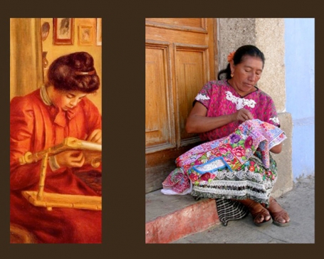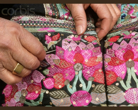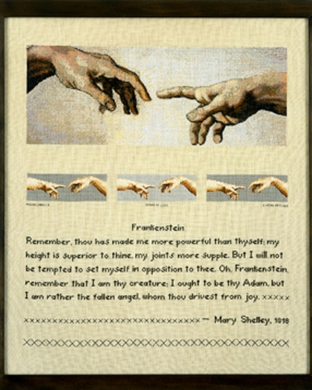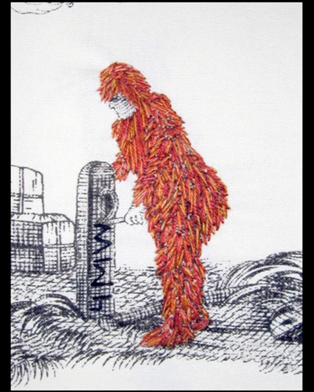 Directly following Halper, artist Elaine Reichek (a conceptual artist who uses embroidery to explore aesthetics in art) delivered a presentation about her artistic path, inspirations and viewpoints. Coming to embroidery through a formal concern with “the disembodied line that wouldn’t adhere to the support,” Reichek shared her work with the audience, detailing her fascination and sometime obsession with mapping, pattern and the often humorous interpretations and translations that can occur from the cross-mixing of cultures, fables and stories.