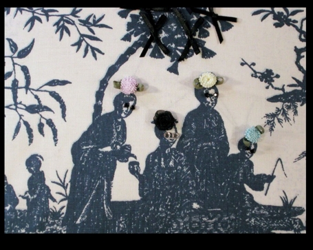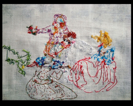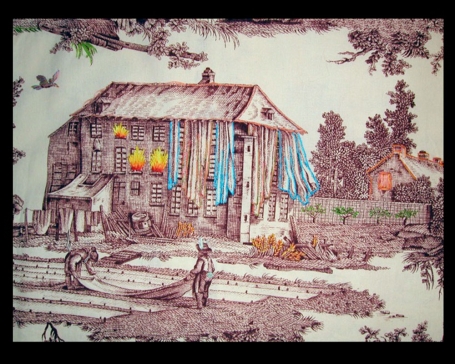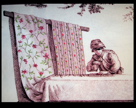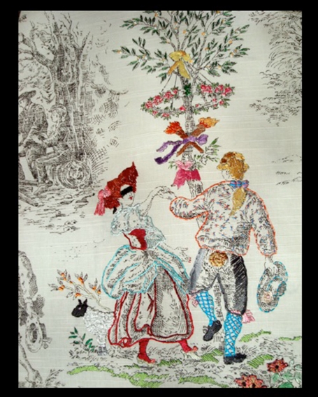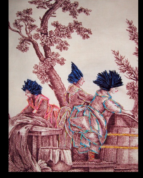 And finally, Richard Saja, (one of the American Craft Council’s very own Searchlight Artists this year – and founder of Historically Inaccurate Decorative Arts) took the audience on a tour of his work (cushions, sofa and bed headboards, among others), inspired by his love of embroidering and embellishing, in intricate detail, on toile. Saja admitted—almost sheepishly—that he comes to craft through the design world via self-taught means. His work is both humorous and sometimes vaguely dark, but intelligently and playfully crafted. Who wouldn’t get a chuckle out of clowns cavorting across Pierre Frey toile—or a hand-stitched image of a dog-faced toile boy? Or landscapes of 18th century fabric designers (again, with the clowns!) at work while the factory ‘burns’ in bright embroidery threads in the background? Have a listen and enjoy!
