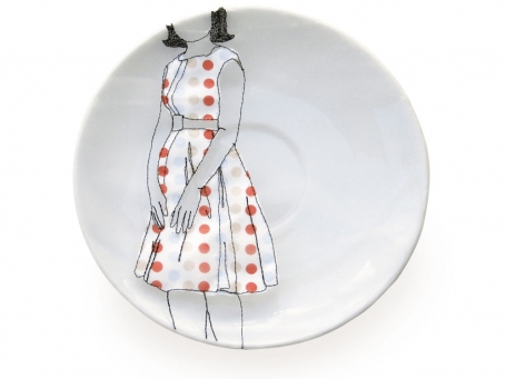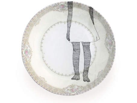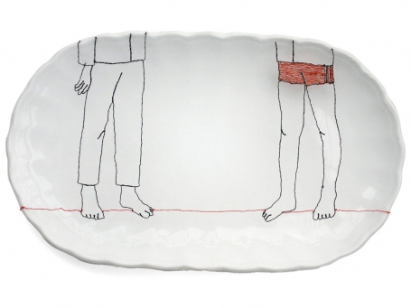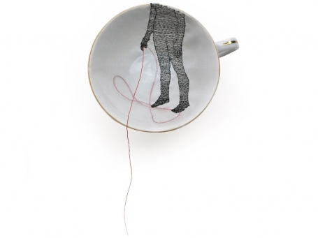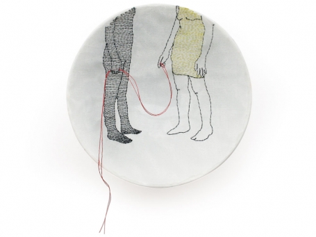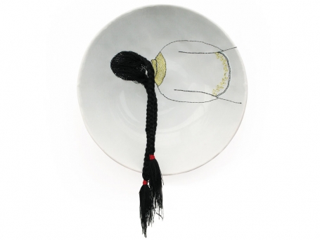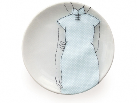 Diem Chau might be described as a memory keeper. From her carved crayons, such as Girl in Green, that reflect on lost innocence, much like a broken crayon, to her embroidered partial figures on stretched cloth that covers discarded dishes, a renewal of an object’s previous life, the past is ever-present in her art.