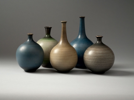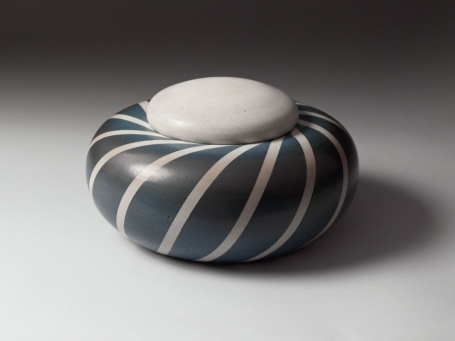 The artist’s disciplined adherence to a cohesive, simplified aesthetic was not unappreciated. Hazel Bray, former curator of art at the Oakland Museum, once remarked: “Over the years his work has accumulated a virtuosity that has become as rich as a Bach fugue in its variations upon a theme. Resisting superficial flirtations with novelty or partially realized expressions is a mark of his strength of personal conviction and maturity.” Bray was not the only appreciator resorting to music to characterize McIntosh’s oeuvre. In an article in American Craft in 1985, the ceramist and writer Mac McCloud observed: “The aerodynamic shapes of McIntosh’s pots resemble the compositions of Erik Satie—sophisticated, complete, airy and instantly rhapsodic.”