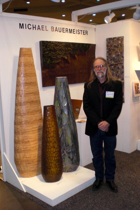 Michael Bauermeister (booth 1805) is a veteran Baltimore Show artist who creates large-scale turned and hand-carved wood vessels. I've seen his work in print before and must say that the near human scale of many of his creations is quite impressive in person. Michael uses a variety of finishes on his vessels, sometimes choosing to showcase the wood itself, sometimes opting for bright blue and yellow stains.