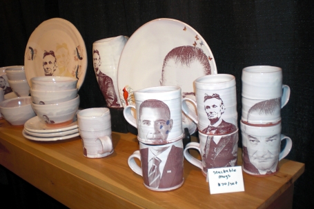 Across from Michael, you'll find Justin Rothshank's stoneware ceramics (booth 1705), which are hand-thrown and decorated with underglaze and overglaze decals. I love Justin's stackable mug sets with faces of American presidents (Lincoln, Johnson and, of course, Obama). What would happen if you mixed and matched them?!