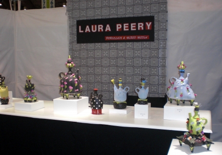 Laura Peery (booth 3400) creates whimsical porcelain teapots inspired by memories from her grandmother's dressmaking shop in New Orleans. I love the bright colors, velvety surfaces and cloth-like textures in Laura's work.