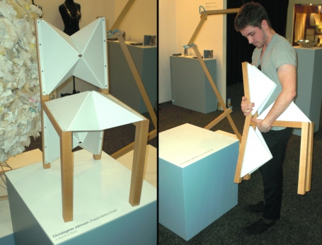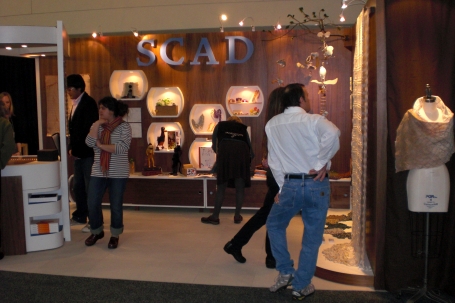 Our School to Market section near booth 100 features exciting new work by craft media students from Rhode Island School of Design and Savannah College of Art & Design. The RISD display, exploring the theme "Principles of Nature," includes a dynamic series of necklaces inspired by spider webs, skeletons and other natural forms. Christopher Johnson, a senior in the RISD furniture design department, made a collapsible wood and plastic chair inspired by the expansion and contraction of duck's feet. The SCAD booth features a lively mix of jewelry, fibers and furniture selected from a juried exhibition held in conjunction with our recent SCAD symposium, "Making Meaning in the Marketplace."