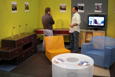 Damian Velasquez (booth 1902) is another veteran Baltimore exhibitor who designs gorgeous handcrafted furniture. Most of his work combines brushed steel and wood, but he's also exhibiting funky chairs and a coffee table made of brightly colored wire mesh.