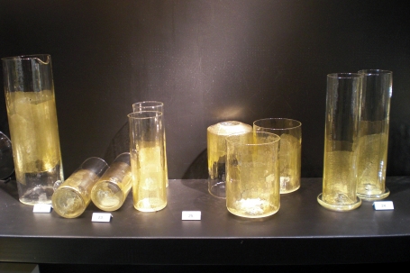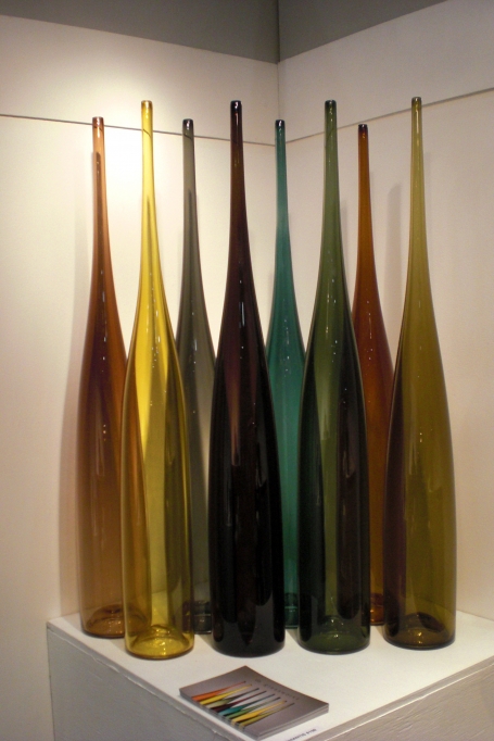 As I was making my rounds, I found a hotspot of great glass artists near the restaurant on the left of the exhibit hall. I've heard other people who work in clay say that they find themselves seduced by glass, and I found myself drawn to this medium over and over again at the Baltimore Show. Devin Burgess of DB Glassworks (booth 3903) has a terrific sense of design that is apparent not just in his work but also in his booth design, which includes an elegant cluster of tall colored vases. I also loved Dan Mirer's hand-blown clear glass vessels accented with gold leaf (booth 3604). Richard Jones of Studio Paran (booth 2502) pressmolds then twists his glass bottles to create a gorgeous undulating texture on the surface, then adds a signature coil of colored glass at the top to finish off the neck of the bottle.