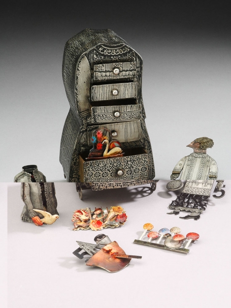 Bloomingdale's, 2007 (detail); nickel silver, sterling silver, brass, copper, decal, diamond; 28"x15"x20"; Private Collection, Courtesy of Mobilia Gallery