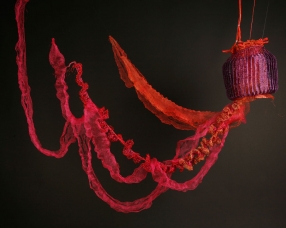 Fisch dives in with textile techniques applied to metal, creating a shimmering street-side aquarium of jellyfish sculptures for the Racine Art Museum’s Windows on Fifth Gallery. More