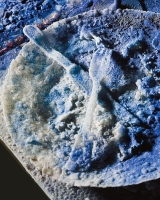 The scene is spectral—a banquet table after a meal laden with plates, wine glasses, silverware and leftover food, but with color in gradations from white through deep sapphire blue through dark gray, and the whole setting covered with a grainy, ashy crust as if newly excavated from layers of earth and ravaged by time. Yet this is no relic of an ancient cataclysm but a recent work of glass art.